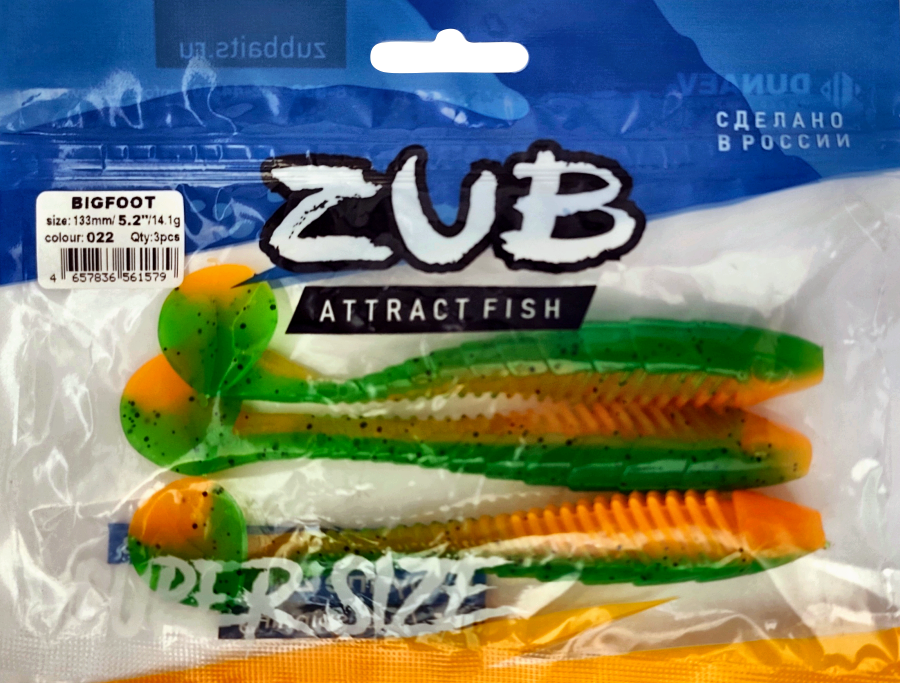 Приманка ZUB-BIGFOOT 133мм(5,2")-3шт, (цвет 022) зеленый верх -оранжевый низ