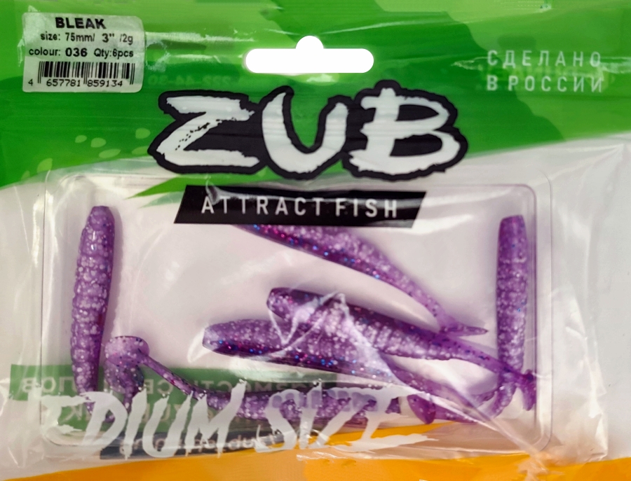 Приманка ZUB-BLEAK 75мм(3")-6шт, (цвет 036) фиолетовый верх - натурал низ