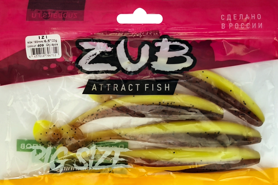 Приманка ZUB-IZI 165мм(6,5")-4шт, (Цвет 409) машинное масло верх - желтый низ