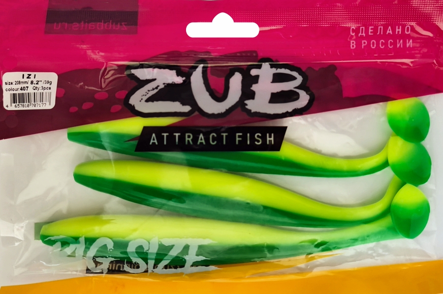 Приманка ZUB-IZI 208мм(8,2")-3шт, (Цвет 407)зеленый верх - желтый низ