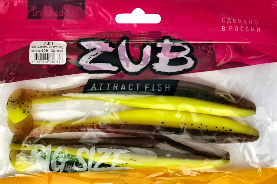 Приманка ZUB-IZI 208мм(8,2")-3шт, (Цвет 409) машинное масло верх - желтый низ