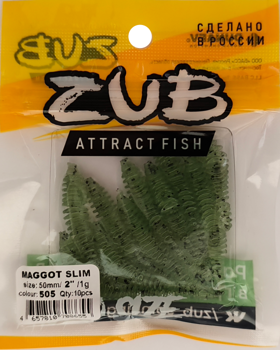 Приманка ZUB-MAGGOT SLIM 50мм(2")-10шт, (цвет 505) зеленый с блестками