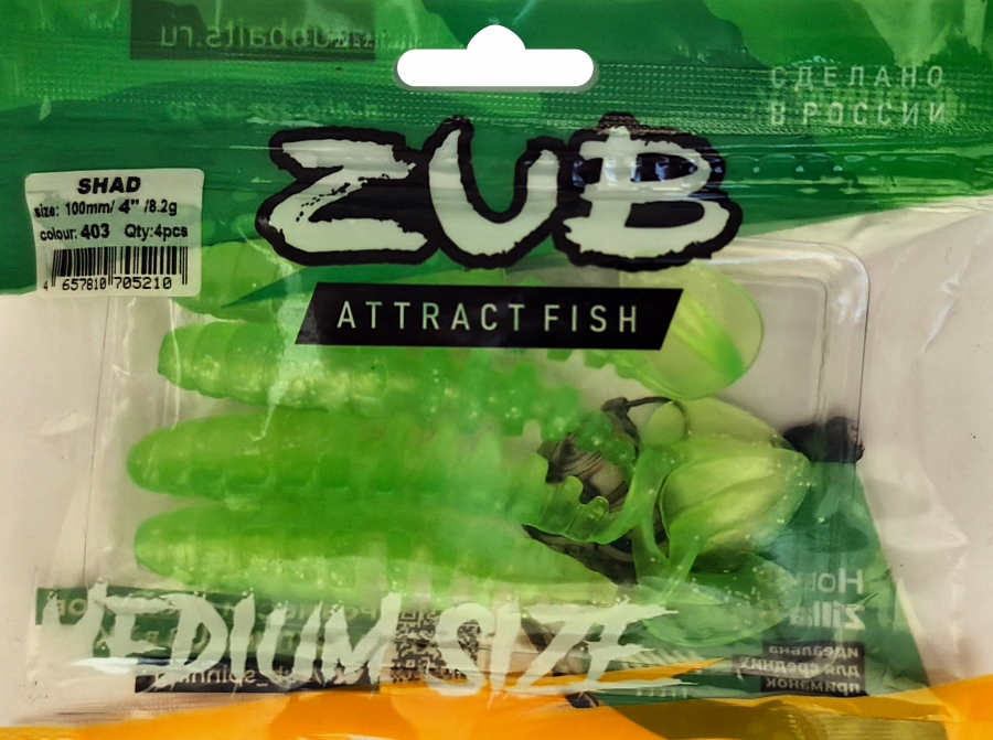 Приманка ZUB-SHAD 100мм(4")-4шт, (цвет 403) зеленый светящийся