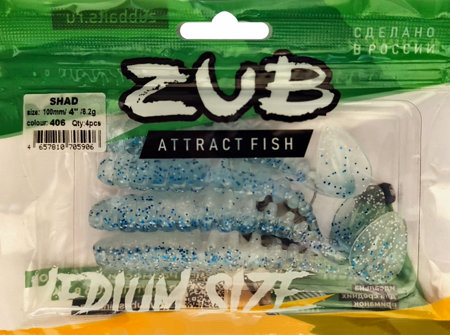 Приманка ZUB-SHAD 100мм(4")-4шт, (Цвет 406) голубой верх - перламутр низ