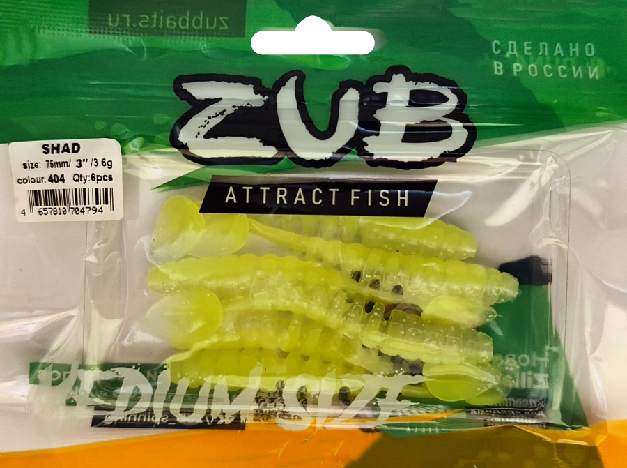 Приманка ZUB-SHAD 75мм(3")-6шт, (цвет 404) желтый светящийся