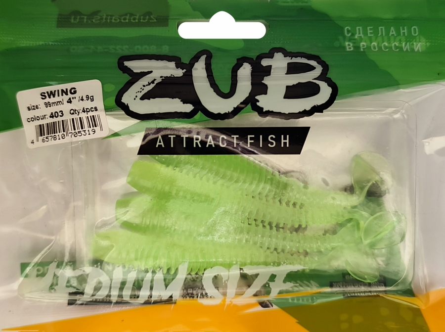 Приманка ZUB-SWING 99мм(4")-4шт, (цвет 403) зеленый светящийся