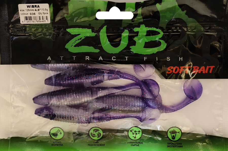 Приманка ZUB-WIBRA 125мм(4,8")-5шт, (цвет 036) фиолетовый верх-натурал низ