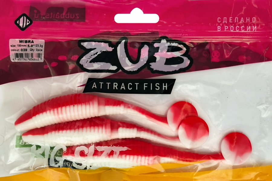 Приманка ZUB-WIBRA 150мм(5,9")-3шт, (цвет 039) красный верх-белый низ (в)