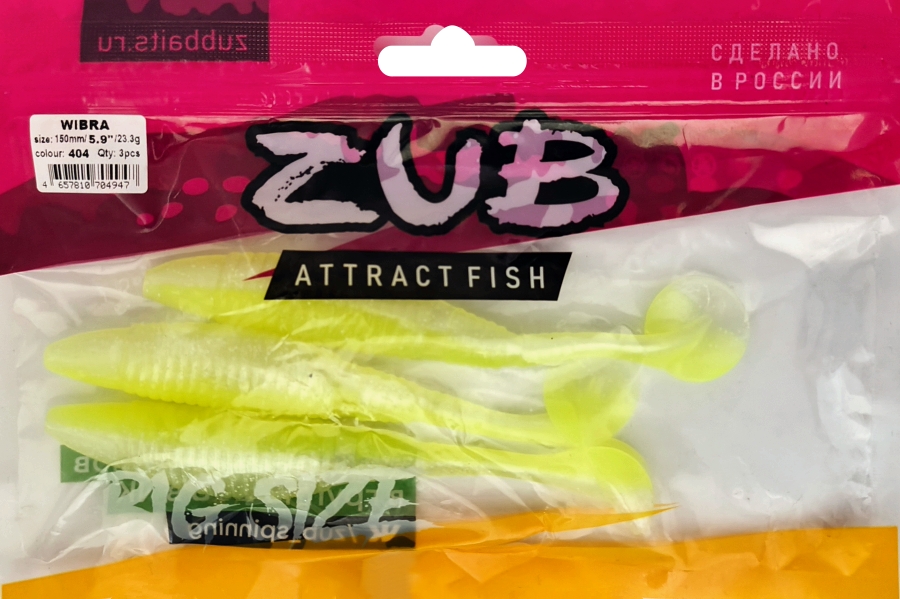 Приманка ZUB-WIBRA 150мм(5,9")-3шт, (цвет 404) желтый светящийся