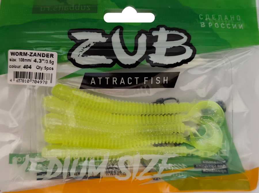 Приманка ZUB-WORM-ZANDER 108мм(4,3")-5шт, (цвет 404) желтый светящийся