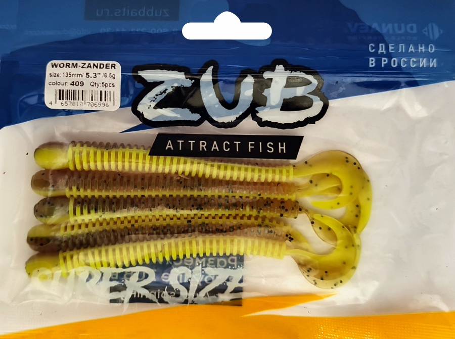 Приманка ZUB-WORM-ZANDER 135мм(5,3")-5шт, (Цвет 409) машинное масло верх - желтый низ
